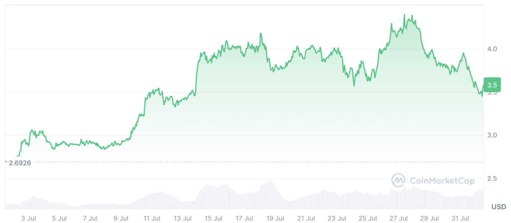 Cena Sui obecnie oscyluje wokół 3,58 USD, przy kapitalizacji rynkowej na poziomie około 12,3 miliarda dolarów i dziennym wolumenie przekraczającym 2,4 miliarda dolarów. Dane pokazują umiarkowaną korektę o około 5% w ciągu ostatnich 24 godzin, po miesiącu silnych napływów kapitału.