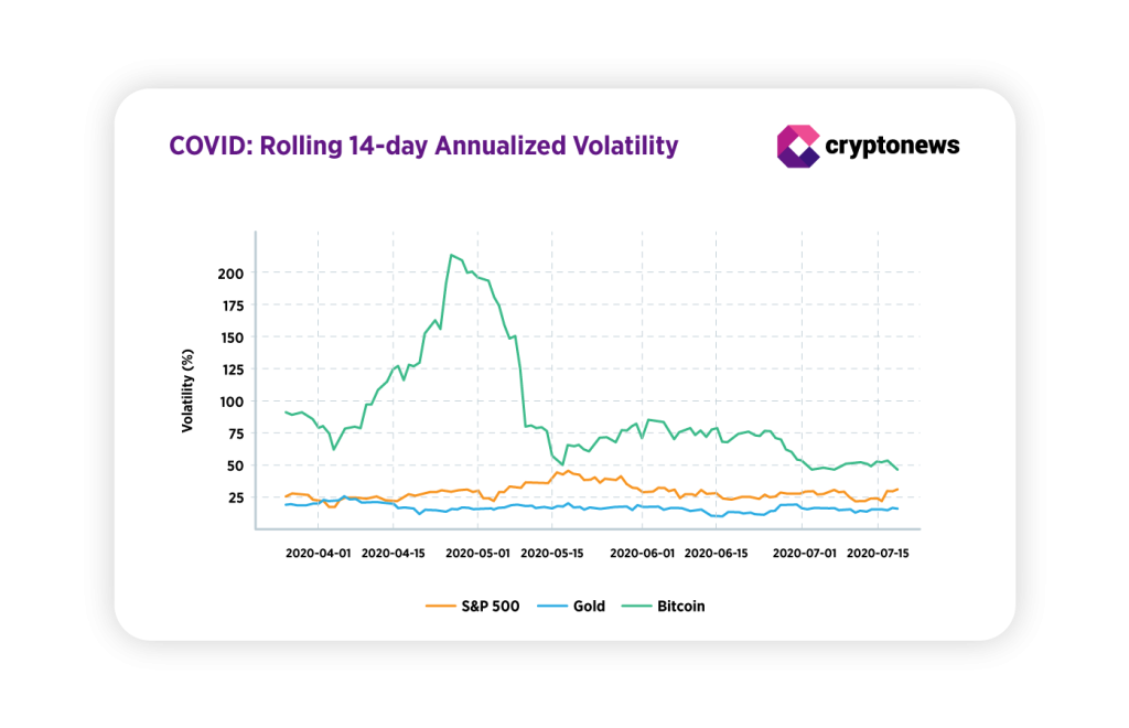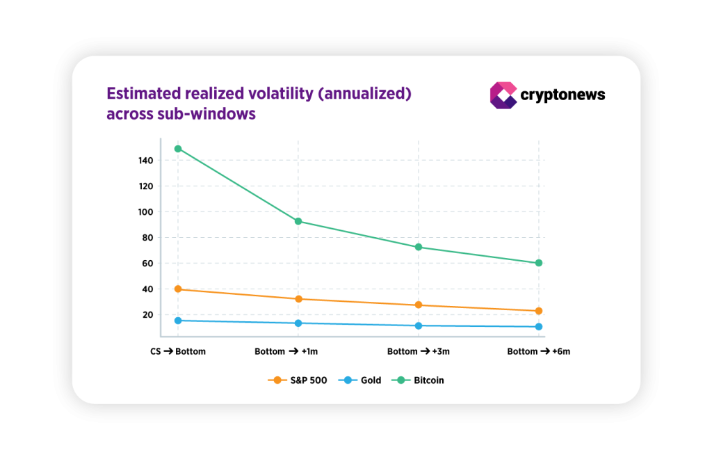 Bitcoin’s realized volatility was an order of magnitude higher than gold’s. Gold’s volatility remained low.