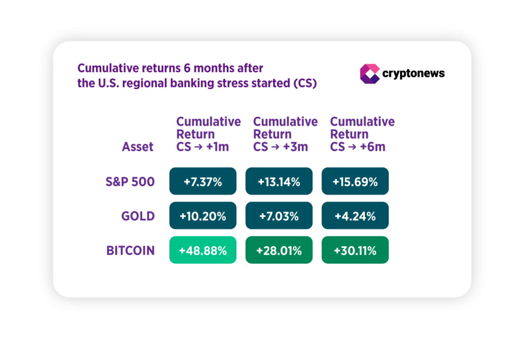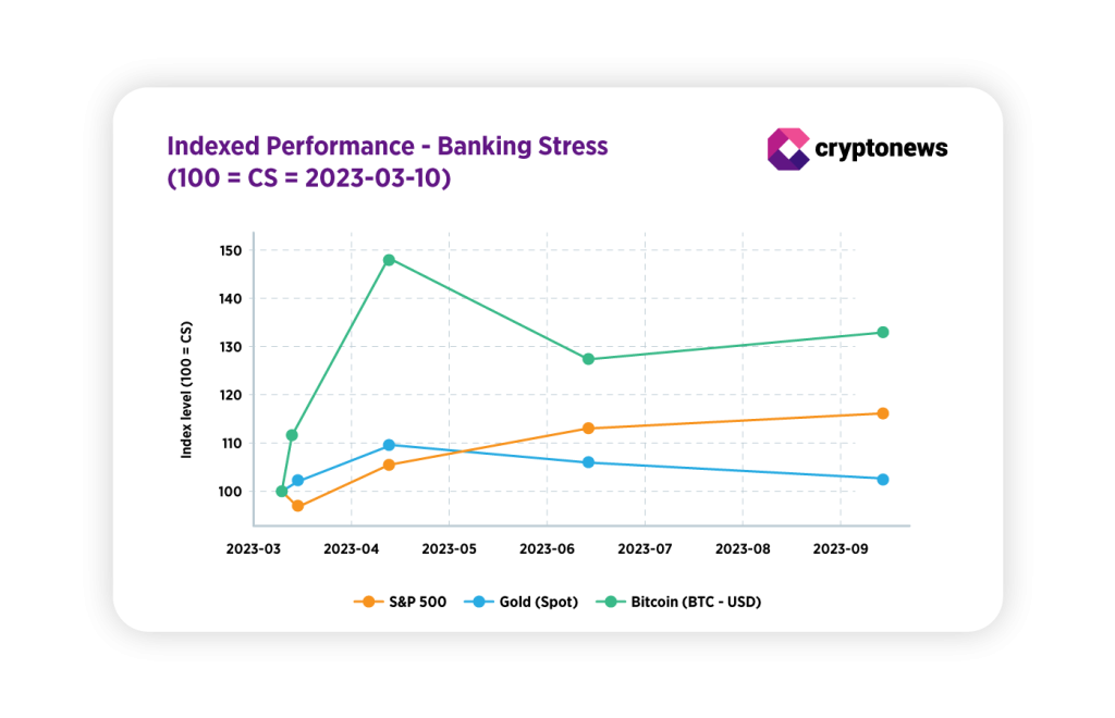 Here are key daily-close metrics for S&P 500, gold, and Bitcoin, anchored to the crisis start (CS), March 3, 2023, and using the S&P bottom (March 13, 2023) as the event bottom for comparability.