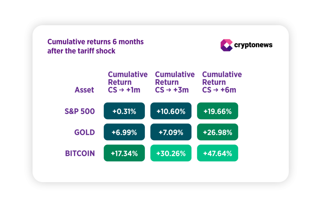 The table below shows the performance of the S&P 500, Bitcoin, and gold — how many days they took to recover to their February–March 12 level, and their cumulative returns one, three, and six months after the market bottom.