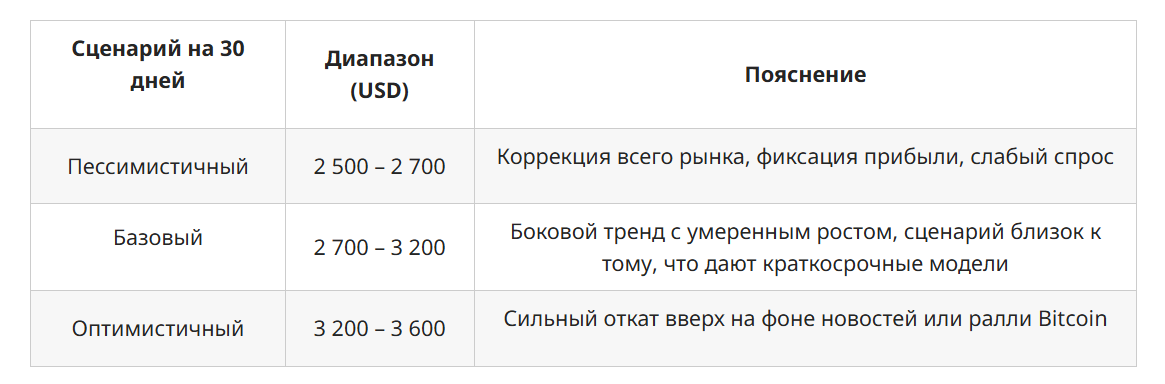 Если негативных новостей не будет, базовый сценарий с диапазоном $2 700-3 200 выглядит реалистично. Но любые прогнозы на месяц по криптовалютам остаются высокорисковыми, и ожидания по ETH нужно постоянно обновлять.