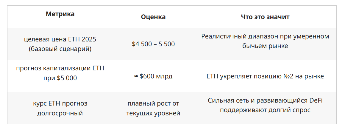 Чем сильнее фундамент, тем более уверенно можно выстраивать Ethereum прогноз 2025 и долгосрочный прогноз капитализации ETH. Ниже, на примере таблицы, мы поясним свои тезисы.