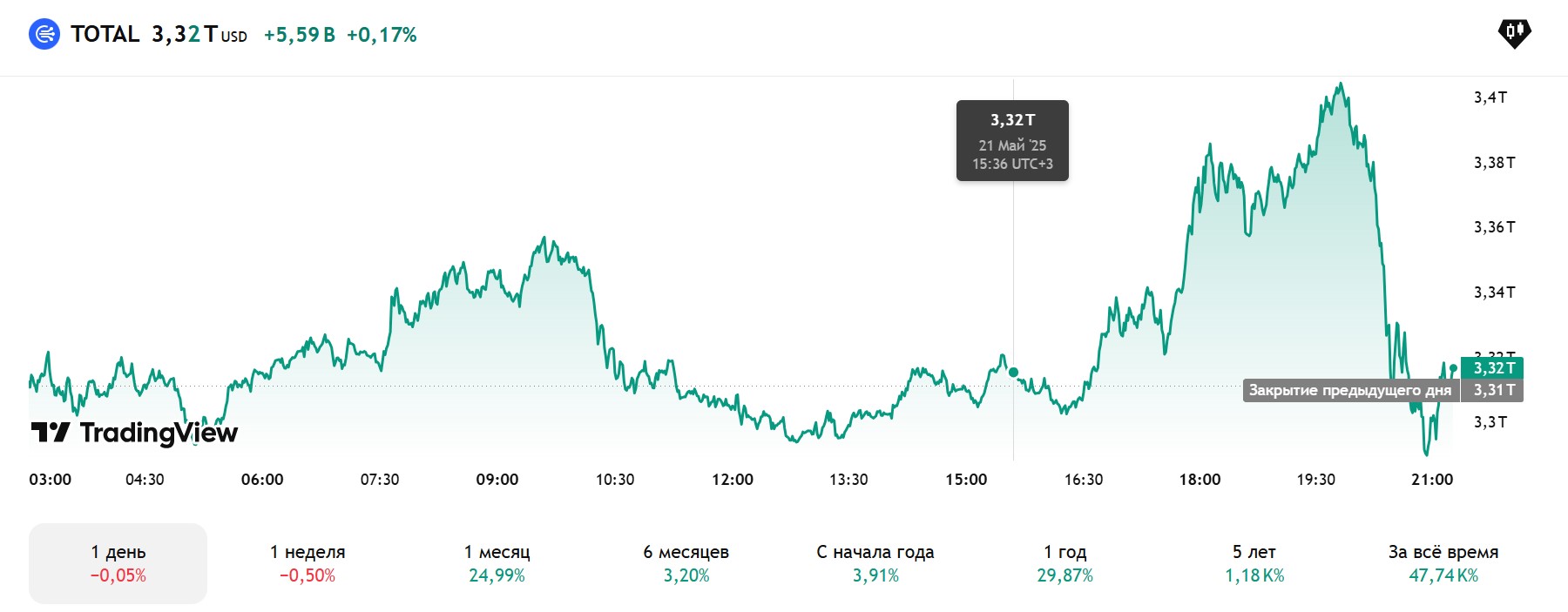 Общая капитализация крипторынка, на момент написания статьи, составляет около $3,3 трлн, по данным TradingView.
