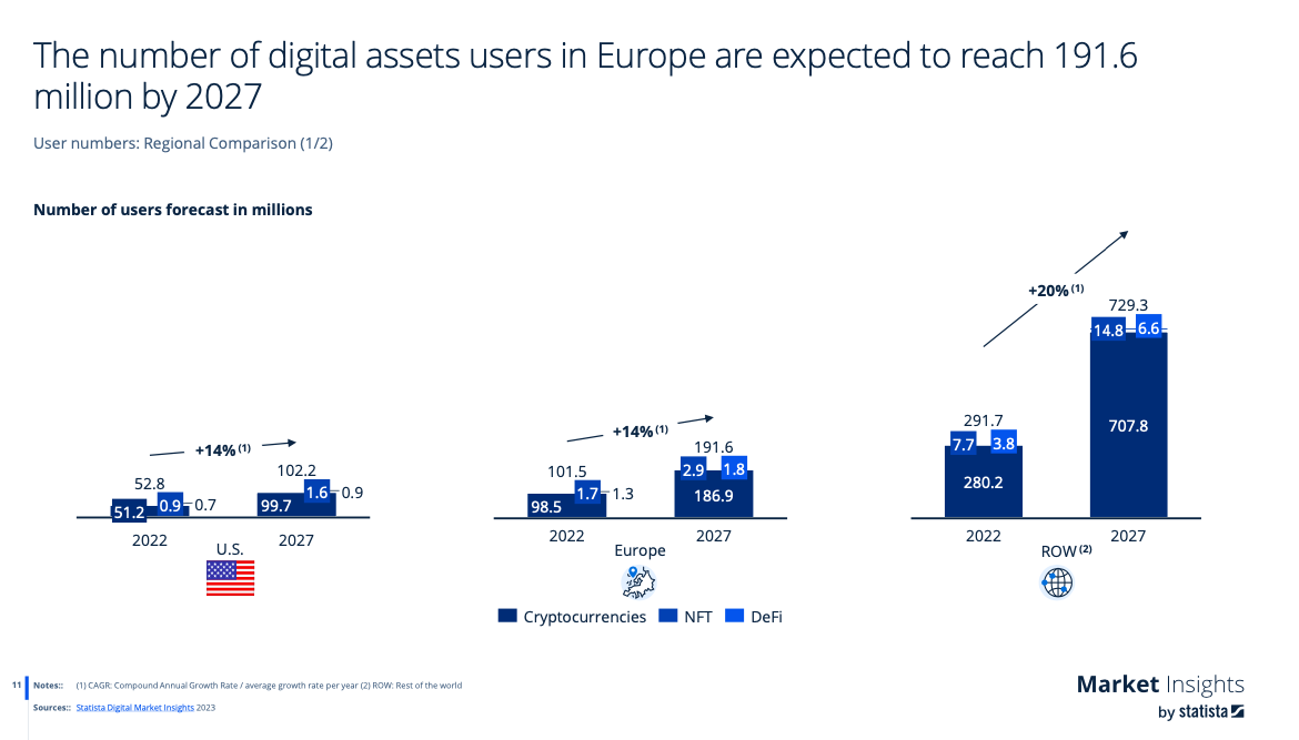 Число европейских пользователей криптовалюты в 2022 году составило 101,5 миллиона; Похоже, что к 2027 году эта цифра вырастет до 191,6 миллиона.