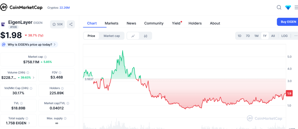 EIGEN сейчас торгуется около $2,00. Актив за сутки вырос на 5%. Интерес связан с растущим принятием рестейкинга и новой AI-функцией от EigenCloud.