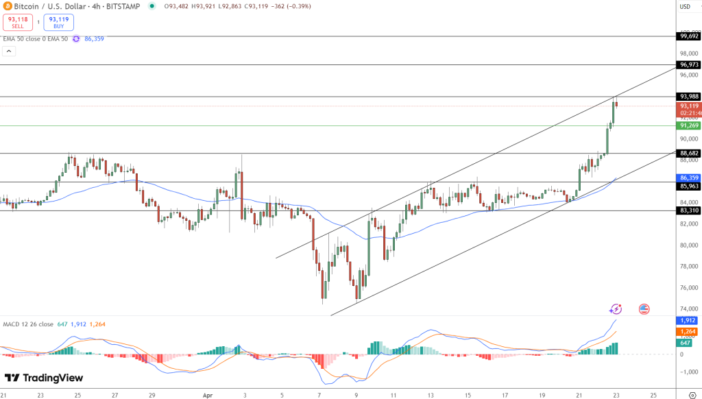 Достигнув пика в $93 988, Биткоин немного откатился назад и сейчас торгуется в районе $93 119. Ралли, начавшееся на отметке $88 682, сформировало крутой восходящий канал на 4-часовом графике.