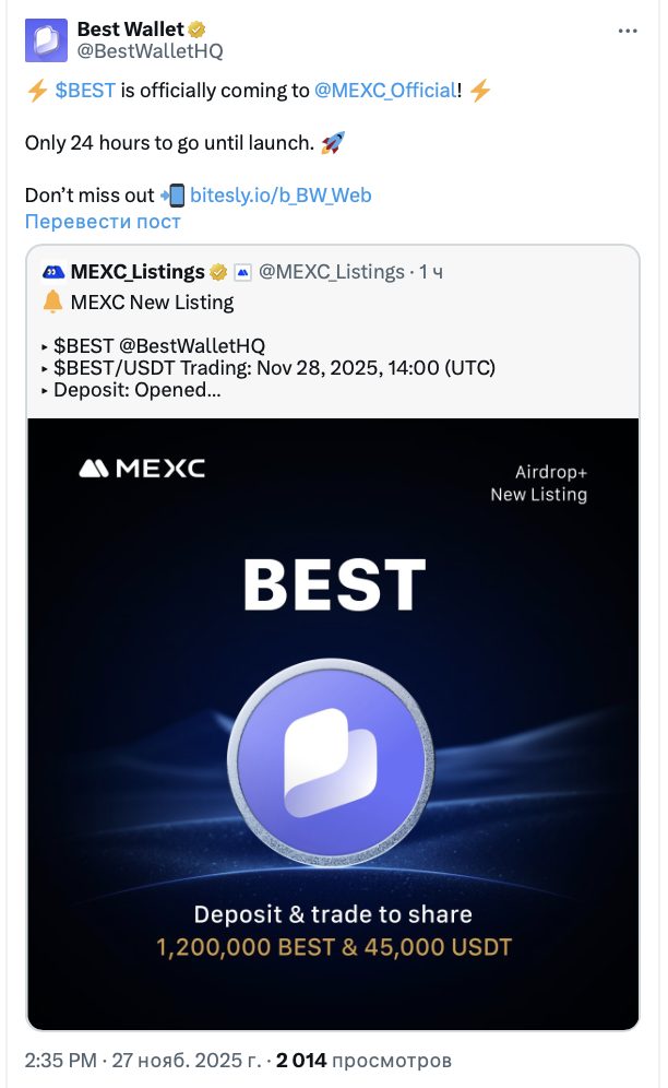 Токен $BEST от Best Wallet вышел на биржу MEXC: аирдроп на 1 200 000 BEST и 45 000 USDT