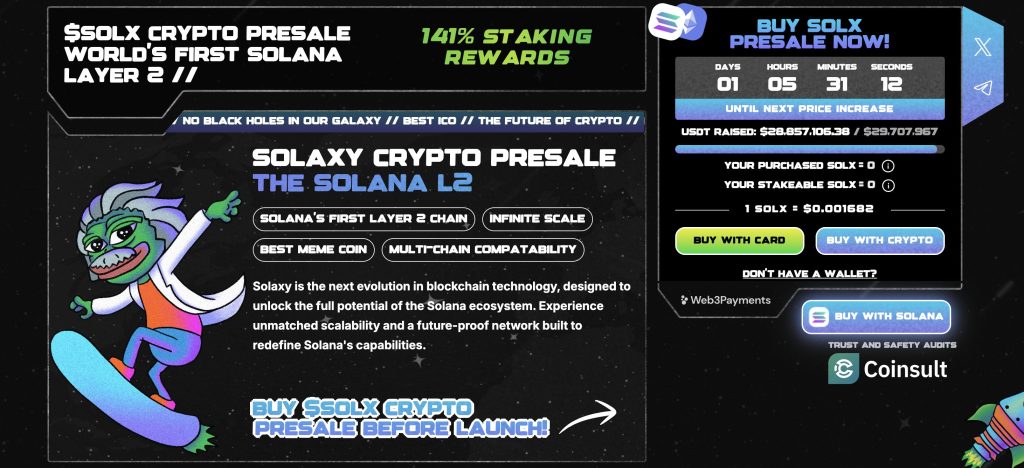 Тем временем наиболее перспективные предварительные продажи криптовалюты, такие как Solaxy (SOLX), предлагают значительный потенциал роста для первых покупателей, поскольку они все еще находятся вне поля зрения большинства инвесторов.