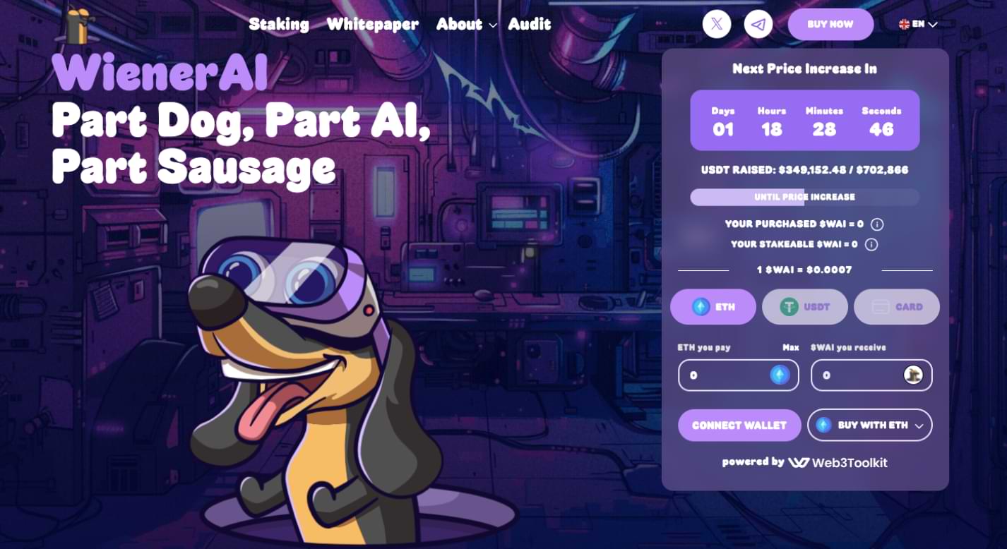 Den senaste hundsensationen inom kryptobranschen är AI meme-myntet WienerAI ($WAI, har redan samlat in över $350,000 de första 14 dagarna av förköpet. Investerare står på kö för att få en tokeniserad del av Ethereums nya cybernetiska “wiener”-hund. WienerAI påminner mycket om en annan framgångsrik tokenlansering, nämligen AI-säkerhetstoken och meme myntet Scotty the AI ($SCOTTY). De samlade in nästan $10 miljoner under sitt förköp nyligen. Genom att kombinera två heta nischmarknader har både $WAI och $SCOTTY inspirerat investerare med löftet om en ny generation mynt. Dessa erbjuder fler skratt och fler användningsområden än vanliga meme-mynt. WienerAI är ännu hemlighetsfulla gällande hur de ska använda AI, men de har gett en del ledtrådar. De viktigaste punkterna kring projektet handlar om höga staking belöningar, där de just nu erbjuder en årlig avkastning på 1876 %. Projektet har även genomgått en hård granskning och har en underhållande community, där du snabbt känner dig välkommen.
