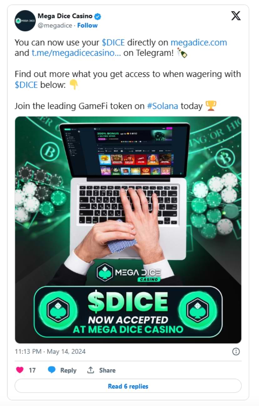 Det Solana-baserade GameFi-token Mega Dice ($DICE) radar upp framgångar och har nu samlat in över $1,5 miljoner under sitt förköp. För att bygga upp spänningen ännu mer kring denna token har Mega Dice nu lanserat en ny stakingfunktion. Det betyder att tokeninnehavare nu kan tjäna en passiv inkomst, finansierad från en del av plattformens vinster. Just nu är en DICE prissatt till $0.0866, men förköpspriset hoppar till ett nytt steg en gång i veckan. Nu är det bara fyra dagar kvar till nästa prisökning, så det finns ingen tid att förlora för den som vill säkra de lägsta priserna. Med en användarbas som nu sträcker sig över 10,000 användare och en månatlig omsättning på över $50 miljoner är Mega Dice verkligen ett ledande kryptocasino. De har även en stor community med över 35,000 följare på X och 14,000 på Telegram. Plattformens inhemska token DICE är hjärtat av alla transaktioner, oavsett om man föredrar casino eller betting. Tokeninnehavare kan dra nytta av flera fördelar som lukrativa bonusar och cashback. De får även tillgång till exklusiva kampanjer där de tävlar om tusentals dollar. Projektet planerar även att noteras på en DEX-börs för ökat likviditet, något som kan få priset att skjuta i höjden. De kan till och med överträffa Rollbit. Missa inte att ta del av allt detta – säkra dina DICE-tokens redan idag!