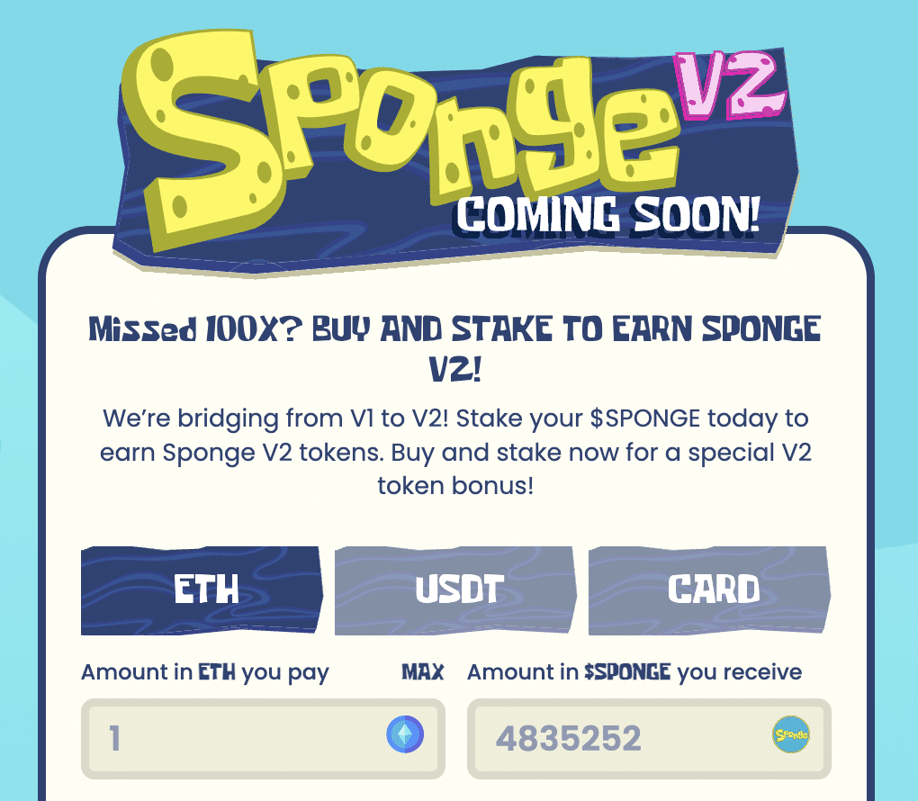 Sponge V2 är ett nytt meme-mynt uppbackat av det ursprungliga teamet. V1-innehavare kommer att behöva överbrygga V1 till V2. Det innebär att V2 redan har 11 300 innehavare. Sponge V2 hoppas nu att bli ännu mer framgångsrik än den första versionen.