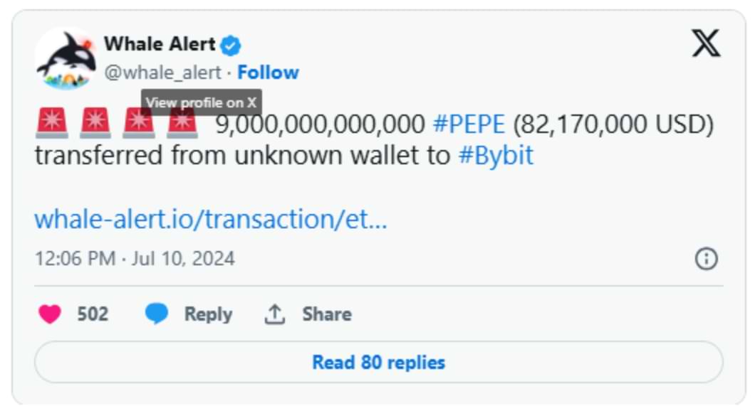 För att lägga till dramat har en val överfört svindlande 9 biljoner $PEPE-tokens till världens näst största centraliserade utbyte, Bybit, som rapporterats av Whale Alert’s inlägg nedan: