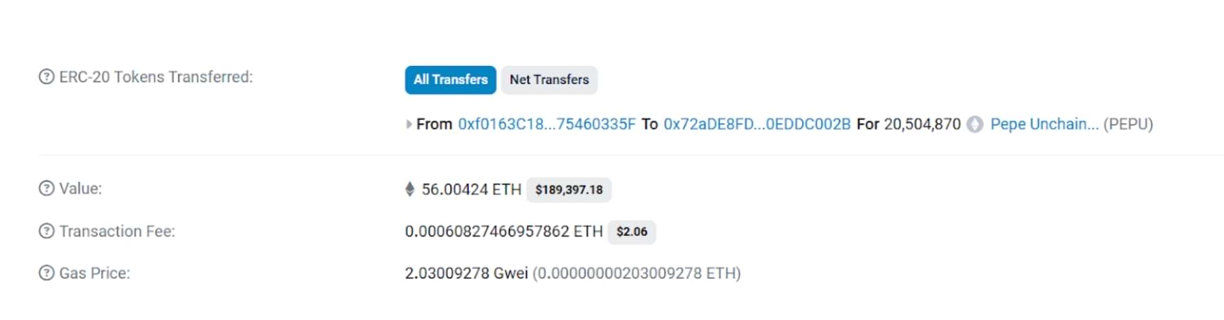 Valen som köpte PEPU spenderade totalt $189,397.18. Han bytte in 56 ETH mot över 20 miljoner PEPU vilket transaktionen nedan visar: (txn id: 0x47c60548d0c12280574f2475d8f5d31105bbffdeea27a1677ebc29eee4e072b2).