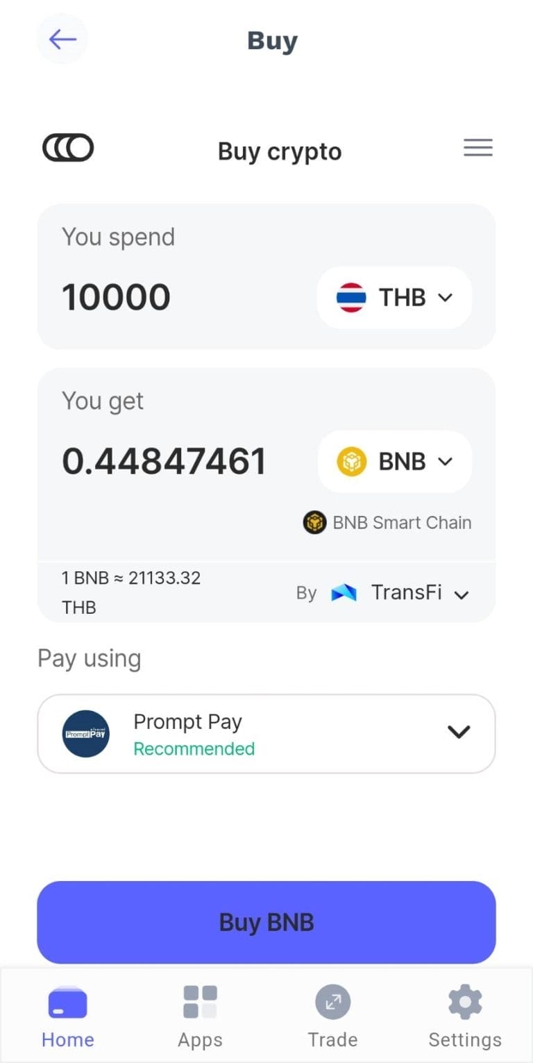 กรอกจำนวนเงินเป็นสกุล THB ตามที่คุณต้องการ โดยระบบจะช่วยค้นหาอัตราแลกเปลี่ยนที่เหมาะสมที่สุดสำหรับคุณ และจะแสดงจำนวน BNB ที่คุณจะได้รับในช่องด้านล่างอย่างชัดเจน ทั้งนี้คุณสามารถเลือกช่องทางการชำระเงินที่สะดวกที่สุดสำหรับคุณได้ ไม่ว่าจะเป็น Prompt Pay, Google Pay, การชำระเงินผ่านบัตรเดบิตหรือเครดิต รวมถึงบริการชำระเงินจากผู้ให้บริการ 3rd Party อื่นๆ ที่รองรับ
