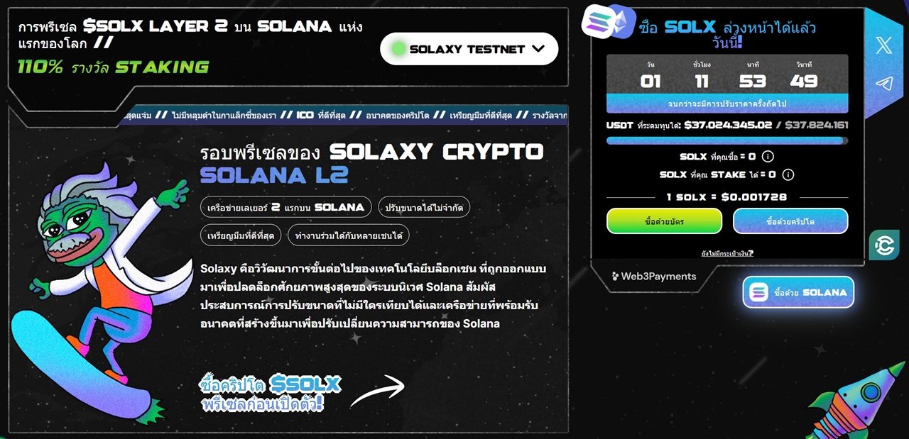 Solaxy โปรเจกต์เลเยอร์ 2 แรกของ Solana ที่กำลังมุ่งมั่นสร้างนวัตกรรมในวงการบล็อกเชน โดยใช้จุดแข็งของ Solana อย่างความเร็วสูงและค่าธรรมเนียมต่ำเพื่อแก้ปัญหาความแออัดของเครือข่ายและการทำธุรกรรมล้มเหลว โปรเจกต์ล้ำสมัยนี้สามารถระดมทุนได้ 500,000 ดอลลาร์ภายใน 24 ชั่วโมงแรกของการเปิดพรีเซล และได้รับความสนใจอย่างมากจากนักลงทุน แม้จะยังไม่เป็นที่ชัดเจนว่า Solaxy เป็นของจริงหรือหลอกลวง