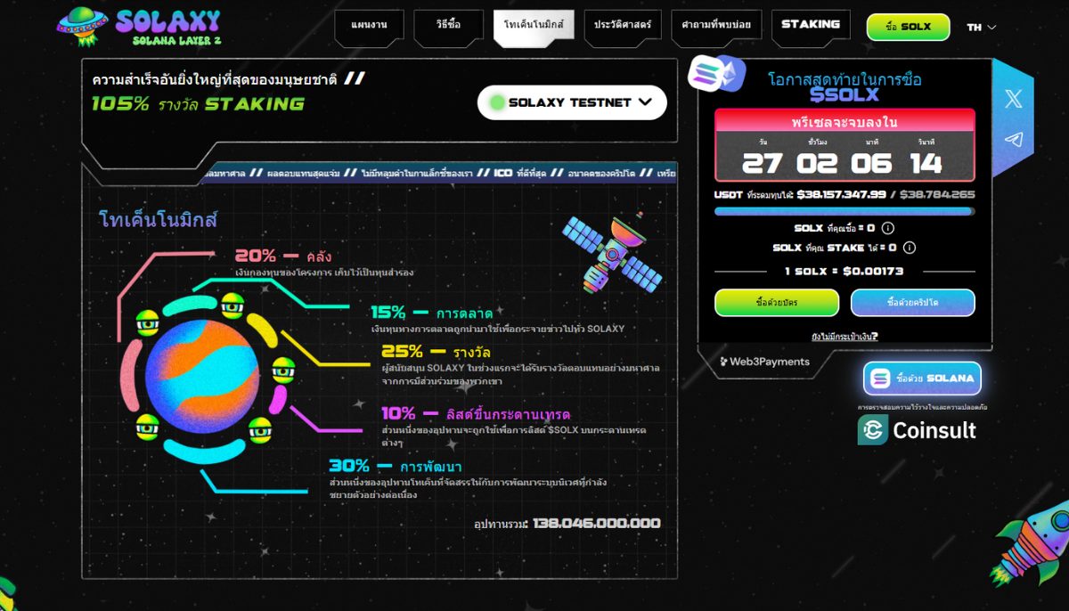 - เฟส 2 (TGE, Bridge, ลิสต์): เมื่อพรีเซลจบลง โทเคนจะเปิดใช้งานแบบมัลติเชน ผู้ลงทุนสามารถบริดจ์โทเคนเข้าสู่ Solaxy เลเยอร์ 2 และเริ่มทำการซื้อขายทั้งบน CEX และ DEX