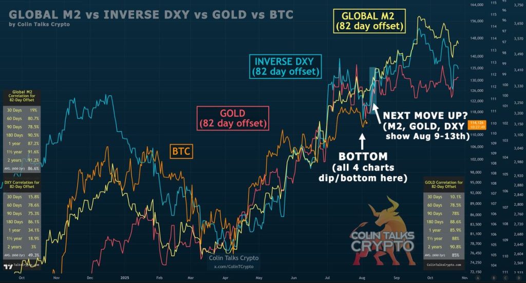 โมเดลของ Colin ไม่ใช่การวิเคราะห์ทางเทคนิคทั่วไป แต่เป็นการนำข้อมูลปริมาณเงิน M2 ของโลก, ดัชนีค่าเงินดอลลาร์สหรัฐแบบผกผัน (DXY), และราคาทองคำ มาเลื่อนไปข้างหน้าเป็นเวลา 82 วัน เพื่อสร้างเป็นกราฟคาดการณ์ซ้อนทับบนกราฟราคา Bitcoin เขาอ้างว่าแนวทางนี้เผยให้เห็นความสัมพันธ์ที่น่าประหลาดใจ ซึ่งสินทรัพย์ดั้งเดิมเหล่านี้สามารถบ่งชี้การเคลื่อนไหวของ Bitcoin ล่วงหน้าได้ถึง 3 เดือน การทดลองนี้กำลังได้รับความสนใจอย่างมากในหมู่นักลงทุนที่มองหาเครื่องมือใหม่ๆ ในการวิเคราะห์ตลาด Bitcoin