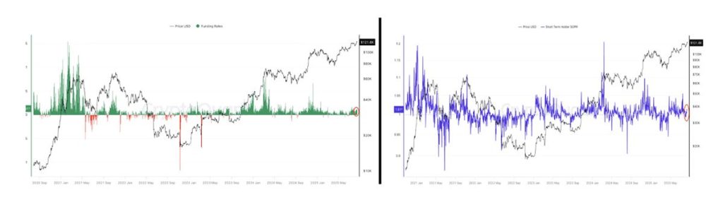 แม้ Bitcoin ทำสถิติสูงสุดใหม่ แต่ข้อมูลบนบล็อกเชนหลายตัวชี้ว่าราคายังไม่ถึงจุดสูงสุด และยังมีโอกาสปรับขึ้นต่อ จากข้อมูล CryptoQuant ตัวชี้วัดภาวะตลาดร้อนแรง (Overheating) อย่าง Funding Rate และเงินทุนไหลเข้าระยะสั้นยังต่ำเมื่อเทียบกับจุดสูงสุดในอดีต นอกจากนี้ การทำกำไรของนักลงทุนระยะสั้นยังจำกัด ซึ่งถือเป็นสัญญาณบวกต่อแนวโน้มราคา อีกทั้ง สัญญาณบวกนี้สอดคล้องกับ การวิเคราะห์ราคา Bitcoin ล่าสุด ที่คาดว่าราคามีโอกาสพุ่งถึงเป้าหมายใหม่