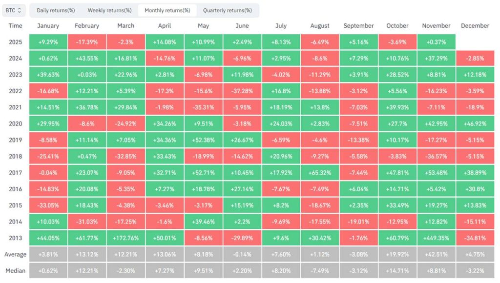 ข้อมูลจาก CoinGlass ยืนยันว่าเดือนตุลาคม 2025 เป็นเดือนที่ยากลำบากสำหรับ Bitcoin โดยปิดตลาดด้วยผลตอบแทนติดลบ 3.7% เหตุการณ์นี้ถือเป็นการสิ้นสุดตำนาน “Uptober” ที่นักลงทุนคุ้นเคยกันดี ซึ่งเป็นปรากฏการณ์ที่ราคา Bitcoin มักจะปรับตัวขึ้นในเดือนตุลาคมเสมอมาตลอด 7 ปีหลังสุด