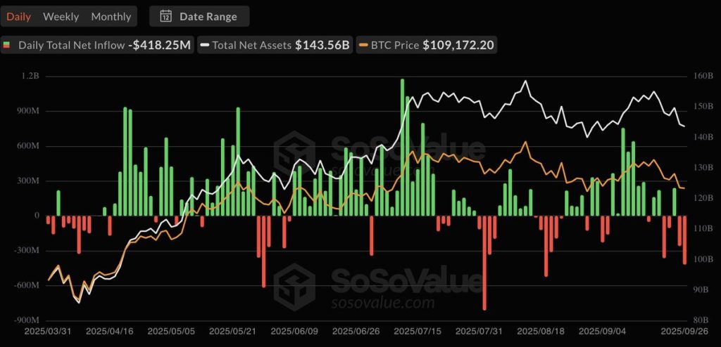 ข้อมูลจาก SoSoValue แสดงให้เห็นว่ากองทุน Spot Bitcoin ETF มีเงินไหลออกสุทธิรวม 902.50 ล้านดอลลาร์ในสัปดาห์ที่แล้ว ซึ่งถือเป็นระดับต่ำสุดในรอบกว่า 30 วัน โดยแรงเทขายส่วนใหญ่เกิดขึ้นในวันศุกร์ที่ 26 กันยายน ซึ่งมีเงินไหลออกสูงถึง 418.25 ล้านดอลลาร์