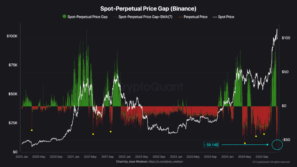 ขณะที่การวิเคราะห์จาก CryptoQuant Quicktake ชี้ให้เห็นถึงความแตกต่างของราคาสปอตและอนุพันธ์ (Spot-Perpetual Price Gap) ใน Binance ซึ่งแตะระดับลบมากที่สุดที่ -59.14 USD ความแตกต่างนี้สะท้อนถึงแรงขายที่เพิ่มขึ้นในตลาดอนุพันธ์ โดยในอดีตเมื่อช่องว่างนี้ถึงจุดต่ำสุดอย่างในภาพข้างล่าง มักเป็นโอกาสในการซื้อ Bitcoin ที่ดี เพราะในทุกครั้งที่ผ่านมาแสดงให้เห็นว่าตลาดมีแนวโน้มปรับตัวกลับสู่สภาวะปกติ ครั้งนี้เช่นกัน การกลับตัวของ BTC อาจตามรอยเหมือนรูปแบบเทรนด์ตลาดคริปโตในอดีต