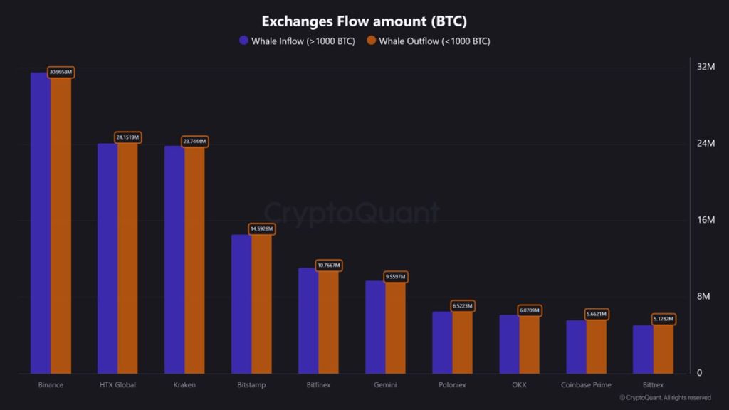 Crazzyblockk นักวิเคราะห์จาก CryptoQuant เปิดเผยว่ากิจกรรมวาฬส่วนใหญ่อยู่บน Binance โดยเฉพาะธุรกรรมที่เกิน 1,000 BTC ซึ่งมีมากกว่า 56 ล้านรายการ ทิ้งห่างคู่แข่งอย่าง HTX ที่มีเพียง 16 ล้านรายการ แสดงให้เห็นถึงบทบาทสำคัญของ Binance ในการเป็นแหล่งซื้อขายหลักสำหรับวาฬ Bitcoin