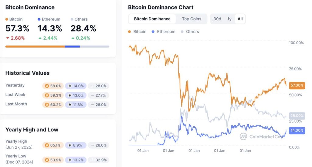 Bitcoin Dominance หรือส่วนแบ่งตลาดของ BTC ได้ลดลง 2.68% เหลือเพียง 57.3% ในขณะที่ Ethereum กลับเพิ่มขึ้นมา 2.44% เป็น 14.3% ซึ่งการเปลี่ยนแปลงนี้สะท้อนออกมาผ่านราคาเหรียญเช่นกัน โดย BTC เพิ่มขึ้นเพียง 1.02% ใน 24 ชั่วโมงที่ผ่านมา ส่วน ETH เพิ่มขึ้นถึง 4.7% อย่างน่าประทับใจในช่วงเวลาเดียวกัน