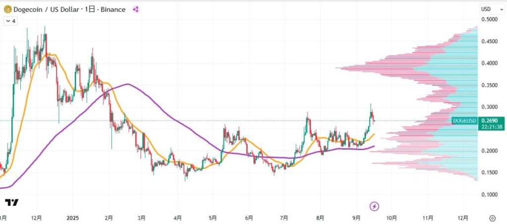 ส่วนในกราฟรายวันพบว่า Dogecoin ยังคงรักษาแนวรับสำคัญที่เส้นค่าเฉลี่ย 100 วันบริเวณ 0.20 ดอลลาร์ และมีแนวรับระยะสั้นที่เส้นค่าเฉลี่ย 20 วันบริเวณ 0.23 ดอลลาร์ หาก Dogecoin สามารถยืนเหนือแนวรับนี้ได้อย่างแข็งแกร่ง เป้าหมายต่อไปคือ 0.40 ดอลลาร์