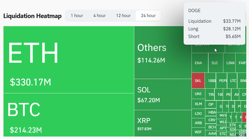 Dogecoin ร่วงกว่า 8% ทำสาย Long โดนล้างพอร์ตกว่า 1,000 ล้านบาท