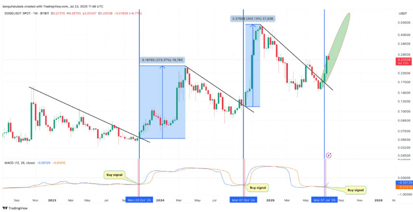 Dogecoin กลับมาเป็นที่จับตามองอีกครั้งในตลาดคริปโต หลังจากนักวิเคราะห์จับตาสัญญาณทางเทคนิคสำคัญอย่าง MACD ที่กำลังจะเกิด Bullish Cross บนกราฟรายสัปดาห์ ซึ่งในอดีตถือเป็นสัญญาณเริ่มต้นของแนวโน้มขาขึ้นที่แข็งแกร่ง