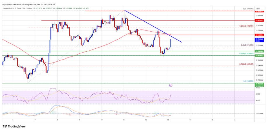 หลังจากที่ราคา Dogecoin พยายามทดสอบแนวต้านที่ 0.1880 ดอลลาร์แต่ไม่สำเร็จ ทำให้เกิดการปรับฐานราคาลงมาอย่างต่อเนื่อง โดยราคาร่วงหลุดระดับ 0.1820 ดอลลาร์และ 0.180 ดอลลาร์ตามลำดับ นอกจากนี้ ราคายังเคลื่อนไหวอยู่ต่ำกว่าเส้นค่าเฉลี่ยเคลื่อนที่ 100 ชั่วโมงซึ่งบ่งชี้ถึงโมเมนตัมขาลงในระยะสั้น