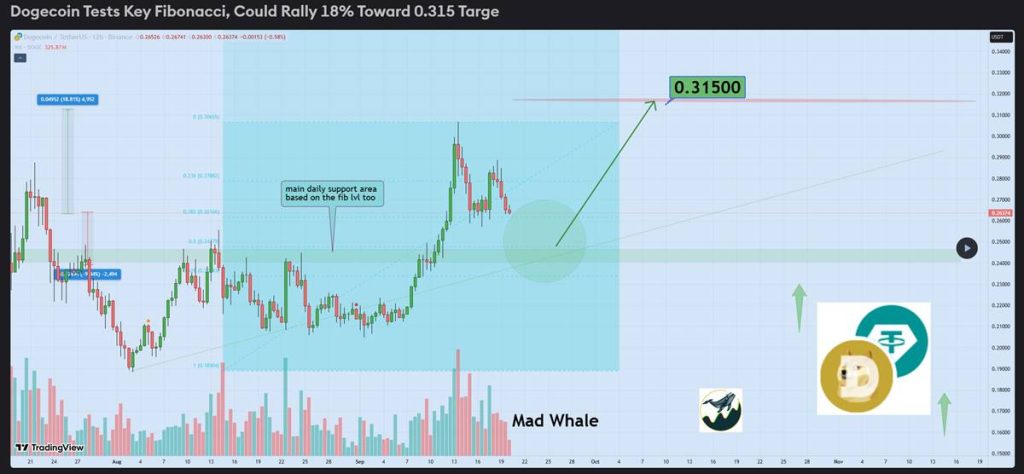 นอกเหนือจากแรงหนุนจาก ETF และการเข้าซื้อของวาฬแล้ว ปัจจัยทางเทคนิคยังคงบ่งชี้ถึงความเป็นไปได้ของการกลับตัวเชิงบวก Dogecoin ยังคงเคลื่อนไหวใกล้ระดับ Fibonacci สำคัญ หากยังสามารถยืนเหนือแนวรับ $0.24 ได้ต่อเนื่อง นักวิเคราะห์คาดว่าราคามีโอกาสปรับตัวขึ้นราว 18% เพื่อทดสอบแนวต้านที่ $0.315