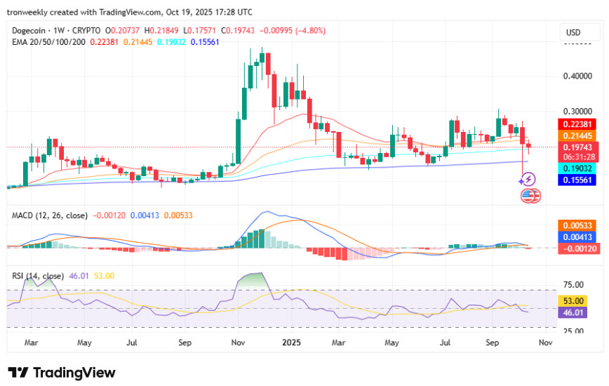 เมื่อพิจารณาจากกราฟรายสัปดาห์ Dogecoin ได้ปรับตัวลงมาอยู่ต่ำกว่าเส้นค่าเฉลี่ยเคลื่อนที่ 20 วัน (0.2238 ดอลลาร์) และเส้นค่าเฉลี่ยเคลื่อนที่ 50 วัน (0.2144 ดอลลาร์) ซึ่งบ่งชี้ถึงภาวะหมีในระยะสั้นและโมเมนตัมขาขึ้นที่เริ่มแผ่วลง โดยมีแนวรับสำคัญอยู่ที่เส้นค่าเฉลี่ยเคลื่อนที่ 100 วัน (0.19 ดอลลาร์) และเส้นค่าเฉลี่ยเคลื่อนที่ 200 วัน (0.155 ดอลลาร์) ในขณะที่แนวต้านที่แข็งแกร่งจะอยู่ที่ช่วง 0.22-0.23 ดอลลาร์