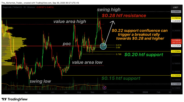 Dogecoin กำลังซื้อขายอยู่ที่บริเวณแนวรับสำคัญราว 0.22 ดอลลาร์ซึ่งเป็นโซนที่แข็งแกร่งด้วยปัจจัยทางเทคนิคหลายอย่างมาบรรจบกัน