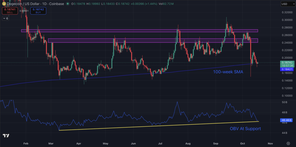 การวิเคราะห์ทางเทคนิคบ่งชี้ถึงความเป็นไปได้ที่ Dogecoin จะเกิดการกลับตัวเป็นขาขึ้นในเร็ว ๆ นี้ โดยตัวชี้วัด On-Balance Volume กำลังอยู่ที่แนวรับสำคัญของเส้นแนวโน้มขาขึ้นและมีแนวโน้มที่จะดีดตัวขึ้นจากจุดนี้