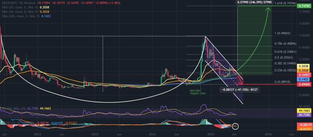 ในมุมมองระยะยาว ระดับราคา 0.168 ดอลลาร์ยังถือเป็นจุดตัดทางเทคนิคที่สำคัญระหว่างแนวโน้มขาลง (Descending Channel) และรูปแบบกราฟ ‘Cup-and-Handle’ ซึ่งโดยทั่วไปบ่งชี้ถึงโอกาสในการเกิดการทะลุแนวต้านหาก Dogecoin สามารถทรงตัวเหนือระดับดังกล่าวได้อย่างมั่นคง