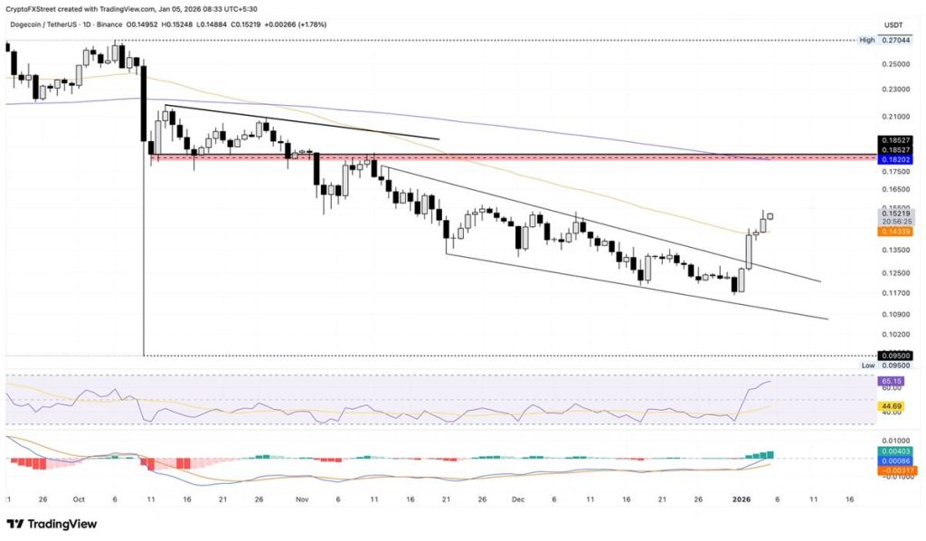 ที่น่าสนใจคือ ราคา DOGE ได้ทะลุกรอบรูปแบบ descending wedge บนกราฟรายวัน ซึ่งมักเป็นสัญญาณเริ่มต้นของขาขึ้น โดยเป้าหมายถัดไปอยู่ที่แนวต้านเส้นค่าเฉลี่ย 200 วัน (200-day EMA) บริเวณ $0.18202 ใกล้กับโซนอุปทานสำคัญ $0.18100–$0.18500