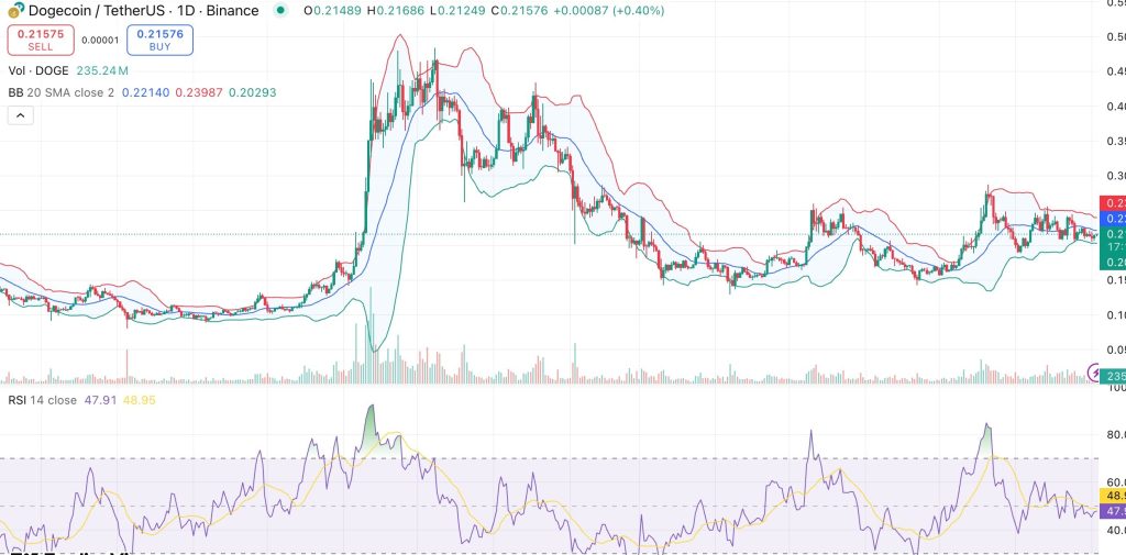 ในเชิงเทคนิค ราคา Dogecoin กำลังอยู่ในสภาวะการเคลื่อนไหวในกรอบแคบ ๆ โดยมีแนวต้านสำคัญที่ 0.22 ดอลลาร์และแนวรับทางจิตวิทยาที่ 0.20 ดอลลาร์ดัชนี RSI อยู่ที่ระดับ 48 ซึ่งเป็นโซนกลาง ๆ ไม่ชี้ทิศทางชัดเจน