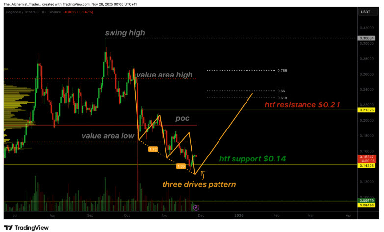 นักวิเคราะห์สรุปว่าเส้นแนวต้านขาลงที่ 0.16 ดอลลาร์คือระดับราคาที่ต้องจับตาอย่างใกล้ชิด การทะลุผ่านแนวต้านนี้ขึ้นไปได้จะเป็นสัญญาณแรกของการเปลี่ยนแปลงทิศทางและการกลับมาของฝั่งผู้ซื้อ