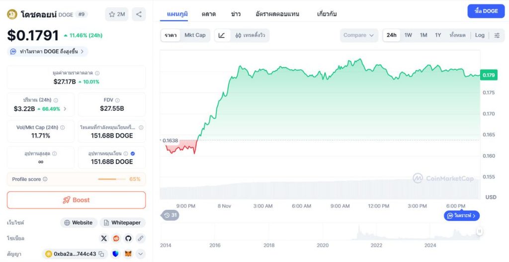 ในช่วง 24 ชั่วโมงที่ผ่านมา ราคา Dogecoin ได้ปรับตัวขึ้นมาอยู่ที่ 0.179 ดอลลาร์เพิ่มขึ้นราว 11% ส่งผลให้มูลค่าตลาดขยับขึ้นไปถึง 27,500 ล้านดอลลาร์ ขณะที่ปริมาณการซื้อขายพุ่งสูงขึ้น 80% แตะ 3,300 ล้านดอลลาร์ ซึ่งสะท้อนให้เห็นถึงกิจกรรมและความสนใจของนักลงทุนที่เพิ่มขึ้นอย่างมีนัยสำคัญ
