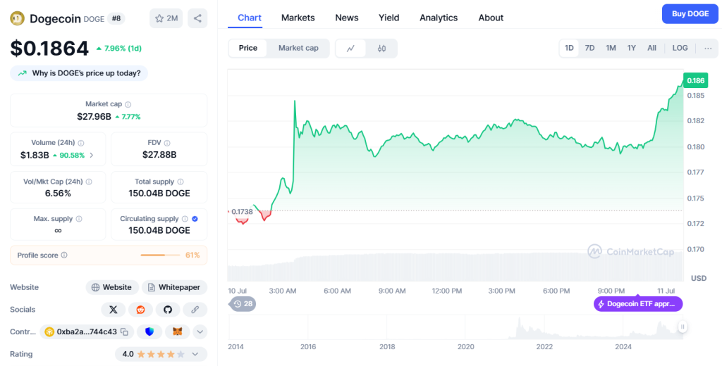 วันที่ 11 กรกฎาคม 2025 — ชุมชน Dogecoin กลับมารู้สึกตื่นเต้นอีกครั้งเมื่อราคา Dogecoin ได้พุ่งเกือบ 8% สู่ระดับ 0.186 ดอลลาร์หลังจากที่เคลื่อนไหวในกรอบแคบระหว่าง 0.165-0.175 ดอลลาร์มานานหลายสัปดาห์