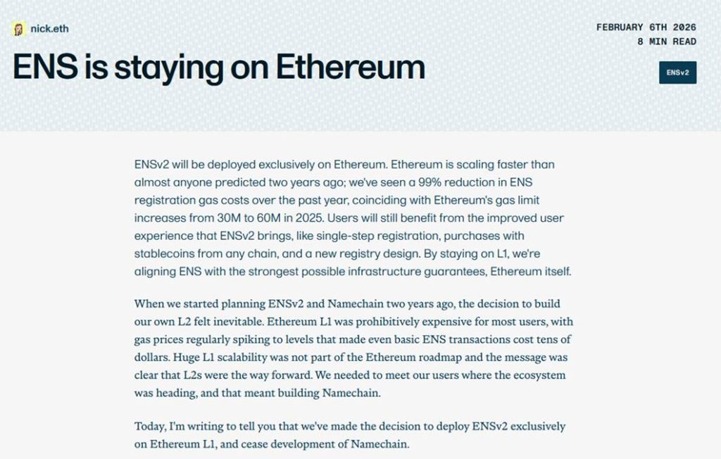 ENS พับแผน L2 หลัง Ethereum สเกลแรงเกินคาด เดินหน้า ENSv2 บน L1 เต็มตัว