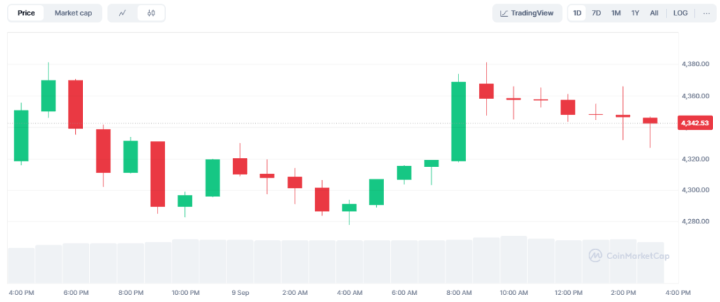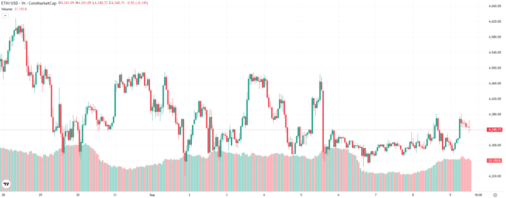 ข้อมูลล่าสุดชี้ว่าราคา Ethereum ยืนอยู่ที่ระดับ 4,300 ดอลลาร์ โดยมีมูลค่าตลาดกว่า 523,000 ล้านดอลลาร์ และปริมาณการซื้อขายใน 24 ชั่วโมงที่ผ่านมาพุ่งขึ้นกว่า 33% คิดเป็นมูลค่ากว่า 32,000 ล้านดอลลาร์ ซึ่งสะท้อนถึงความต้องการที่เพิ่มขึ้นจากทั้งสถาบันและนักลงทุนรายย่อย