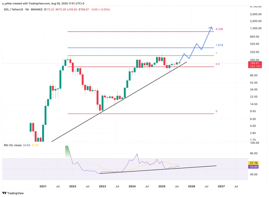กราฟรายเดือน SOL/USDT ของ Solana แสดงถึงการสร้างรูปแบบสามเหลี่ยมขาขึ้นที่ทรงพลังบนกราฟรายเดือน พร้อมยืนเหนือแนวรับเส้นเทรนด์ ขณะที่ RSI ก็ไต่ระดับขึ้นยืนยันความแข็งแกร่งภายใน หาก SOL ทะลุโซน $210–$220 ได้ เป้าหมาย Fibonacci ถัดไปอยู่ที่ $420 (1.618) และ $1,300 (4.236) ซึ่งหมายถึงโอกาสพุ่ง 6–8 เท่า ยิ่งฐานนาน การเบรกเอาต์ก็ยิ่งรุนแรง