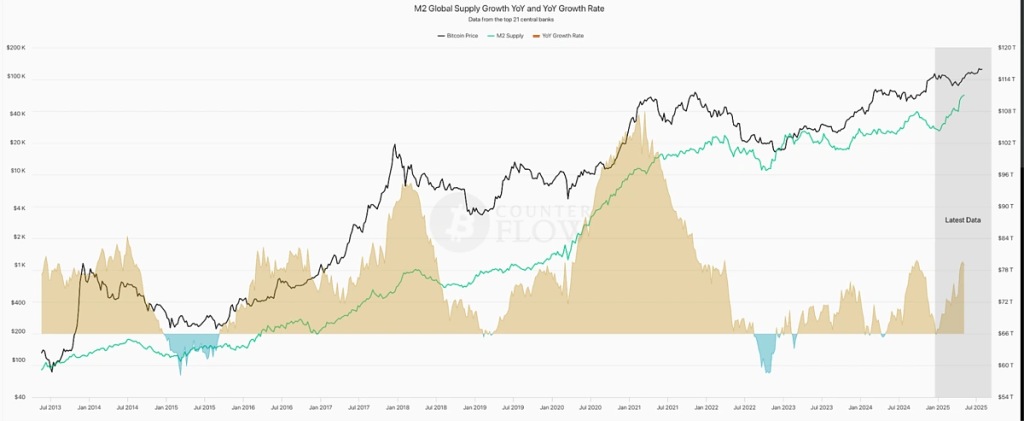 นอกจากนี้ ปริมาณเงินในระบบ M2 (M2 money supply) ทั่วโลก ซึ่งเป็นมาตรวัดสภาพคล่องที่สำคัญ ก็กำลังเพิ่มขึ้นในอัตราที่เร็วที่สุดนับตั้งแต่ต้นปี 2021 สร้างสภาวะที่เอื้ออำนวยอย่างยิ่งต่อสินทรัพย์เสี่ยง (Risk Assets) เช่นกลุ่มเหรียญ Altcoin ทำให้นักลงทุนกล้าที่จะลงทุนในสินทรัพย์ที่ให้ผลตอบแทนสูงขึ้น ซึ่ง Altcoin คือหนึ่งในนั้น