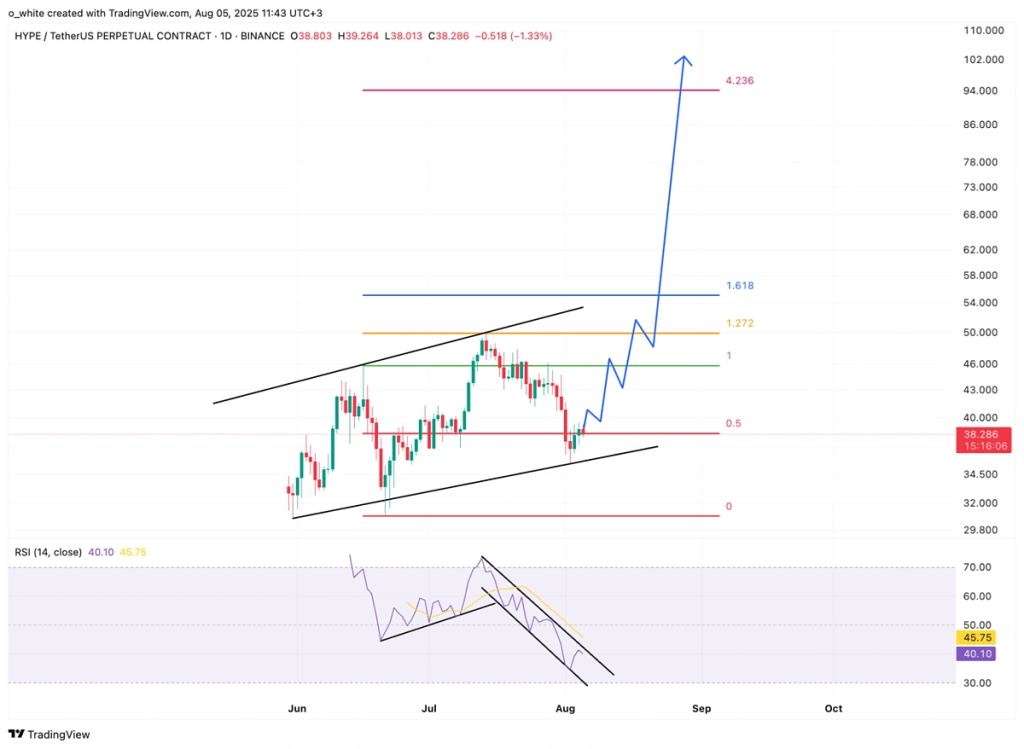 กราฟรายวัน HYPE/USDT ชี้ให้เห็นว่า HYPE เพิ่งแตะโซน Fibonacci 0.5 OTE พร้อมสร้างรูปแบบ Falling Wedge ขนาดใหญ่บน RSI รายวัน ซึ่งแข็งแรงกว่าราคาเองที่เด้งจากเส้นเทรนด์ หากราคาทะลุเหนือ $40 ได้อย่างชัดเจน เป้าหมายต่อไปคือ $50 (ATH), $56 (1.618 Extension) และอาจไปถึง $100 (4.235 Extension) ได้อย่างรวดเร็ว นี่คือเหรียญ Low-Float ที่พร้อมพุ่งแรงเหมือนติดจรวด