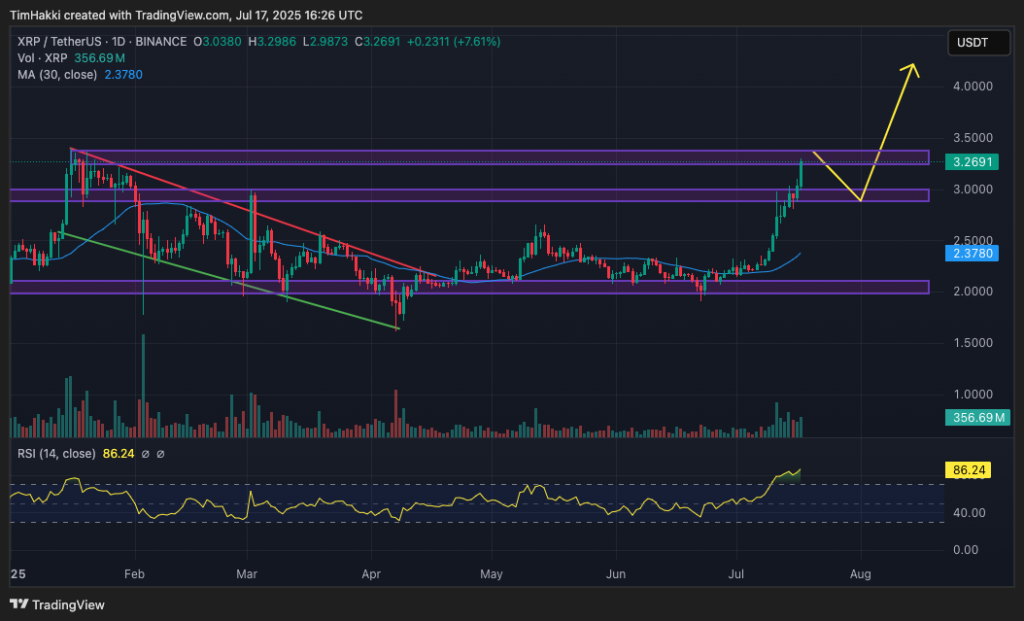 ปัจจุบัน ราคา XRP กำลังอยู่ในช่วงขาขึ้นที่แข็งแกร่ง โดยเพิ่มขึ้น 9% ใน 24 ชั่วโมงที่ผ่านมา และ 32% ในสัปดาห์ที่แล้ว ซึ่งดูเหมือนว่าจะได้รับแรงหนุนจากการเข้าซื้อของนักลงทุนรายใหญ่หรือ ‘วาฬ’ การเข้าซื้อเหล่านี้ส่งผลให้ดัชนีความแข็งแกร่งสัมพัทธ์ (RSI) ของ XRP พุ่งสูงถึง 86 ซึ่งเป็นสัญญาณที่บ่งชี้ถึงแรงซื้อที่ร้อนแรงอย่างมาก แม้ว่าอาจจะมีการเทขายทำกำไรในระยะสั้น แต่แนวโน้มโดยรวมยังคงเป็นบวกสำหรับ XRP