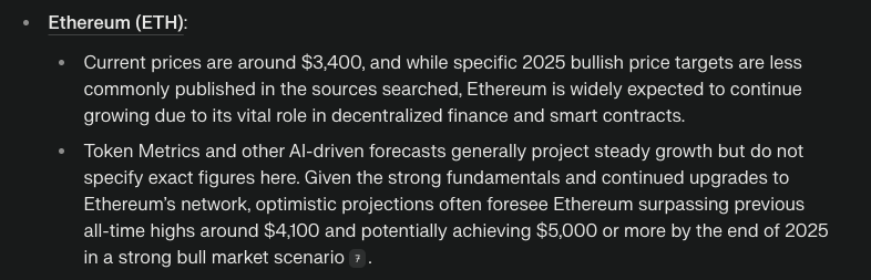 Perplexity คาดว่าแนวโน้มราคา ETH อาจไต่ขึ้นไปถึง 5,000 ดอลลาร์ภายในสิ้นปีนี้ ซึ่งเป็นการเพิ่มขึ้นอย่างมีนัยสำคัญจากราคาปัจจุบันที่ประมาณ 3,403 ดอลลาร์ ปัจจัยสนับสนุนการคาดการณ์นี้มาจากการอัปเกรดเครือข่ายที่กำลังจะเกิดขึ้น, การเป็นรากฐานสำคัญของ DeFi และ NFT รวมถึงการยอมรับจากสถาบันที่เพิ่มขึ้น โดยเฉพาะอย่างยิ่งการมาถึงของกองทุน Spot ETH ETF ที่เปิดโอกาสให้นักลงทุนเข้าถึง ETH ได้อย่างถูกกฎหมาย