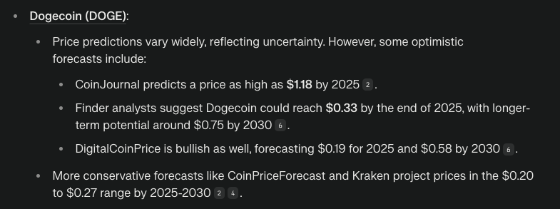 Perplexity ทำนายว่าอนาคตราคา Dogecoin อาจพุ่งไปถึง 1.18 ดอลลาร์ในช่วงตลาดกระทิง ซึ่งหมายถึงผลตอบแทนที่อาจสูงถึง 5.5 เท่า ในด้านการยอมรับ บริษัทใหญ่อย่าง Tesla ยังคงรับชำระค่าสินค้าบางรายการด้วย DOGE ในขณะที่แพลตฟอร์มอย่าง PayPal และ Revolut ได้รวม Dogecoin เข้าไว้ในระบบการชำระเงิน ซึ่งช่วยเพิ่มประโยชน์ใช้สอยในโลกแห่งความเป็นจริงให้กับเหรียญมีมตัวนี้