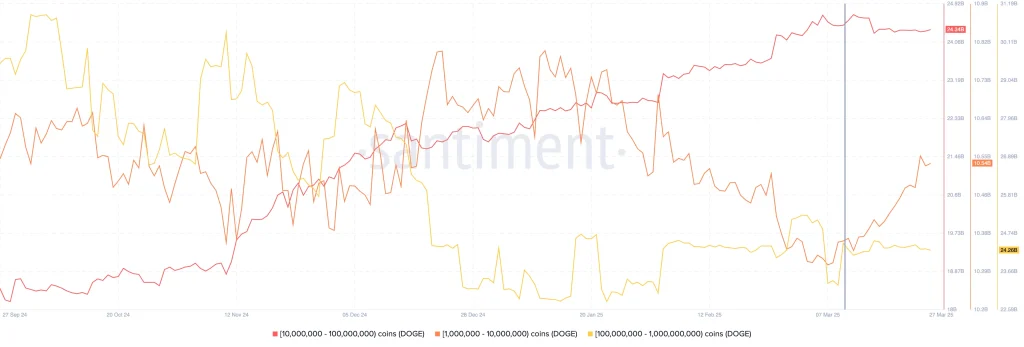 การวิเคราะห์ On-chain ให้ข้อมูลเชิงลึกที่น่าสนใจเกี่ยวกับ Dogecoin โดยข้อมูลจาก Santiment แสดงให้เห็นว่ากลุ่มผู้ถือ Dogecoin ที่มีเหรียญจำนวน 1 ล้านถึง 10 ล้าน DOGE ได้เพิ่มปริมาณการถือครองอย่างต่อเนื่องตั้งแต่วันที่ 10 ถึง 27 มีนาคม 2025